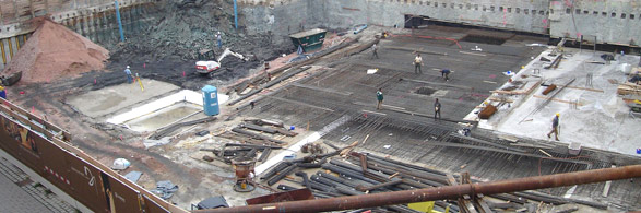 max. 9 m tiefe Baugrube im Grundwasser, Bohrträgerverbau mit Spritzbetonausfachung 2-fach